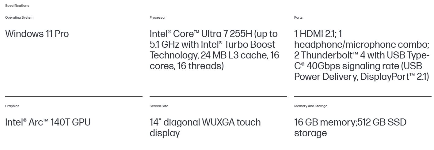 Processor Intel® Core™ Ultra 7 265H (up to 5.3 GHz with Intel® Turbo Boost Technology, 24 MB L3 cache, 16 cores, 16 threads)